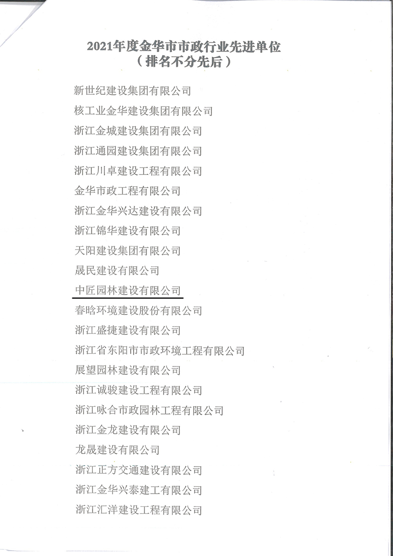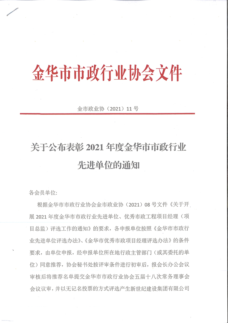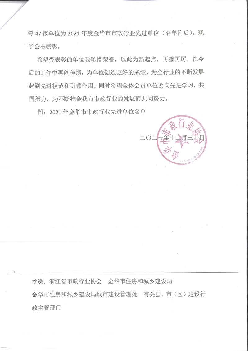 關于公布表彰2021年度金華市市政行業先進單位的通知