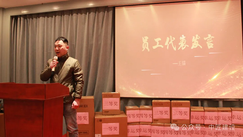 老員工們代表的是公司的光輝成果,而新員工們更象征著公司的未來,是公司的希望。新員工代表——工程部王鐳上臺發言。他表示感謝公司的信任與認可,他目前剛加入中匠大家庭不久,會積極努力將自己的知識運用到每日工作中,為公司帶來新的能量和力量。