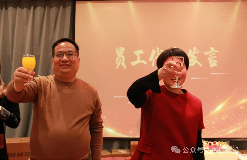 占旭君董事長在致辭中,首先對所有辛勤工作的中匠人和在背后默默支持的家屬們表達了衷心的感謝。其次,他回顧了過去公司取得的成績,著重提及了永康二中食堂、永康花川學校項目榮獲了錢江杯、省標化工地榮譽;仙居縣河埠大橋項目獲得了省市政金獎、省標化工地及括蒼杯等榮譽。