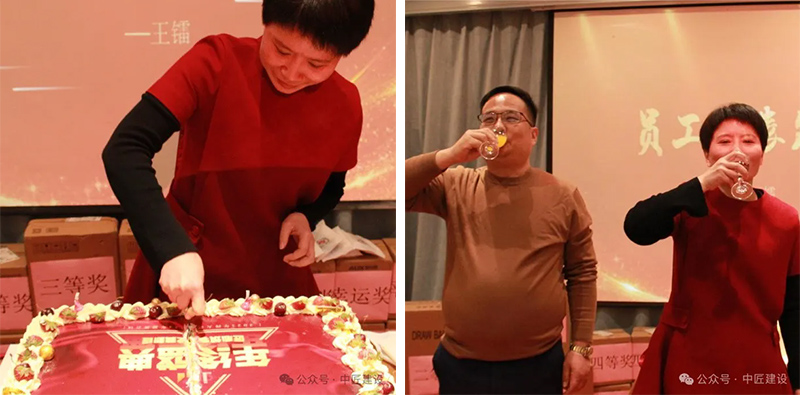 隨后,董事長與董事長夫人上臺親自為大家切年會蛋糕,并與大家共同舉杯慶祝中匠更美好的未來。